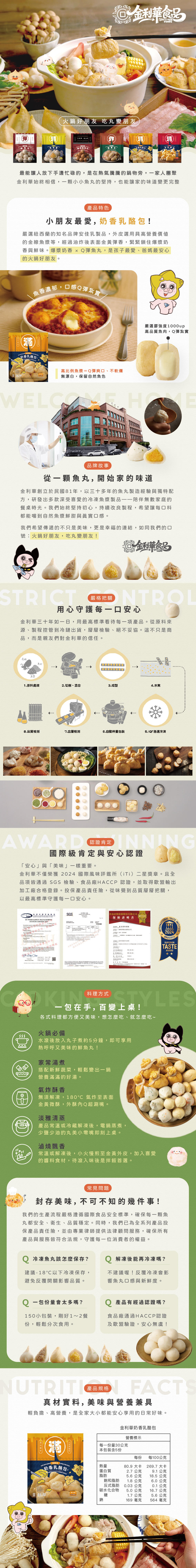 內容物成分(如含有豬、牛成分請加註國別):魚漿(魚肉、糖、蛋白、多磷酸鈉、焦磷酸訥)、棕櫚油、芥花油(非基因改造)、海藻糖、糖、健美鮮(麥芽糊精、食鹽、蔗糖、黄豆水解蛋白、玉米發酵醬、小麥水解蛋白)、木糖、鹽、水、沙拉醬(玉米澱粉、乳清蛋白)、奶油[殺菌乳脂(來自牛乳)、乳酸、發酵餾出物]、蛋白粉、奶粉、洋蔥醬(洋蔥)、豐味通(酵母抽出物)、高達乾酪(殺菌牛乳、鹽、乳酸菌、植物性凝乳酵素)、水解卵磷脂、蒜抽出物(蒜頭抽出物、蔗糖)