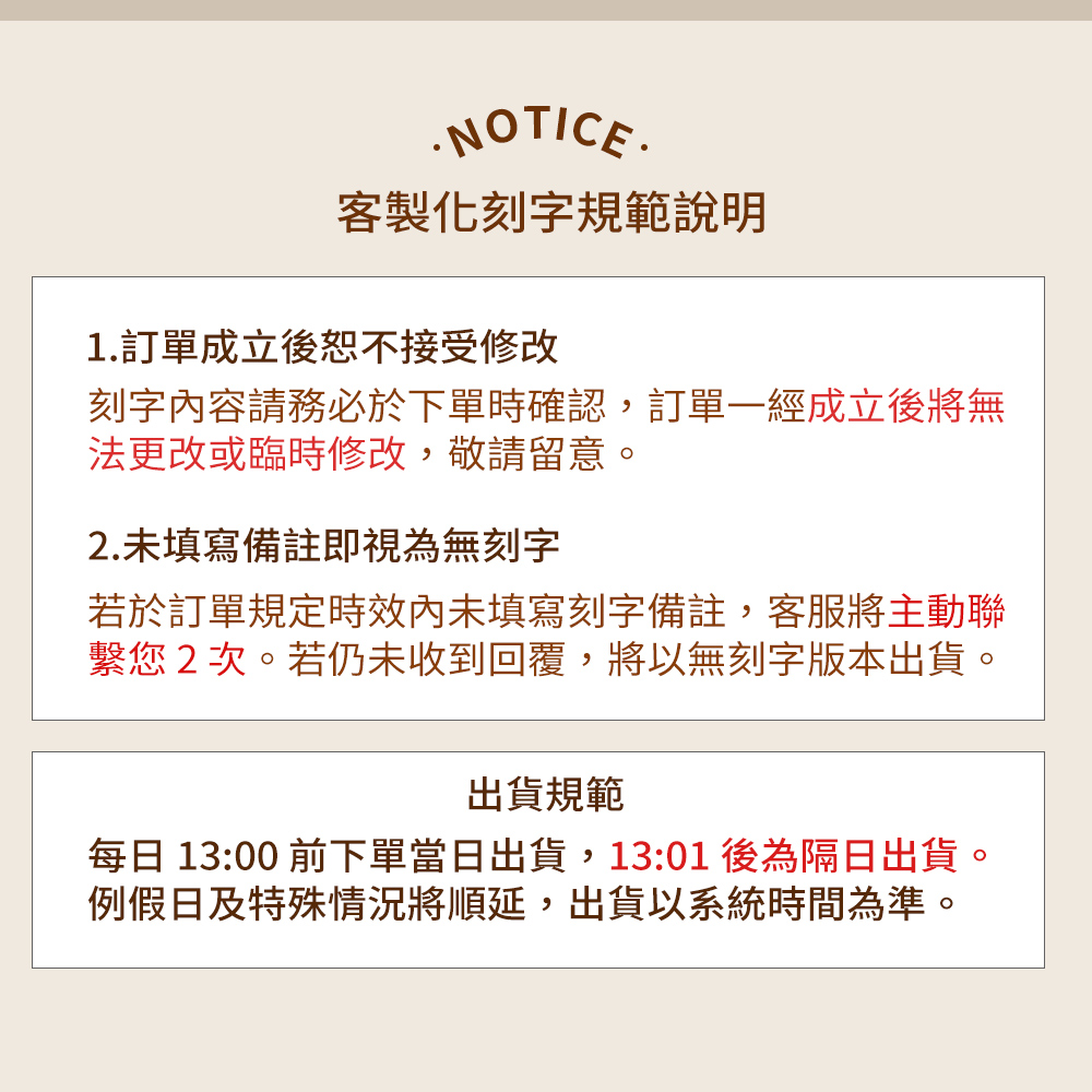 ※如超過規範時間內填寫、資訊不全、變更配送地址等,將延後至下一個工作天出貨