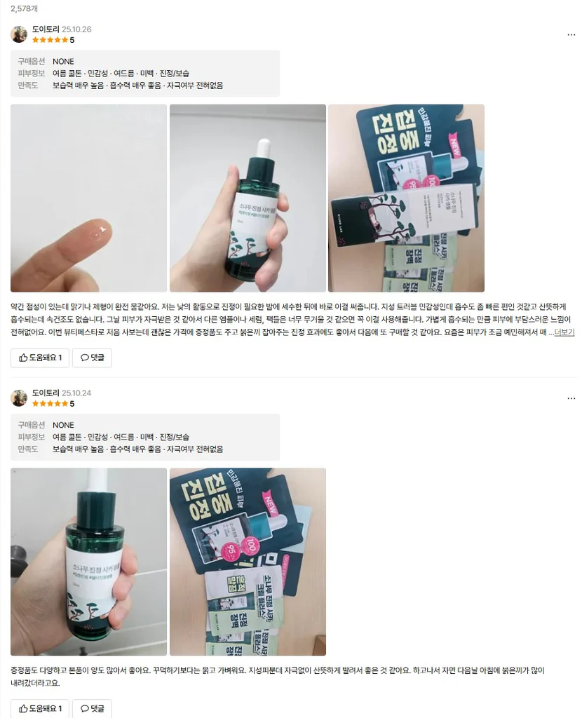 成分表顯示:「소나무잎추출물(松葉萃取物) 792,555ppm」=約 79.2555 % 的原料含量。其他包括:병풀추출물(積雪草萃取物)11,589ppm = 約 1.1589%。