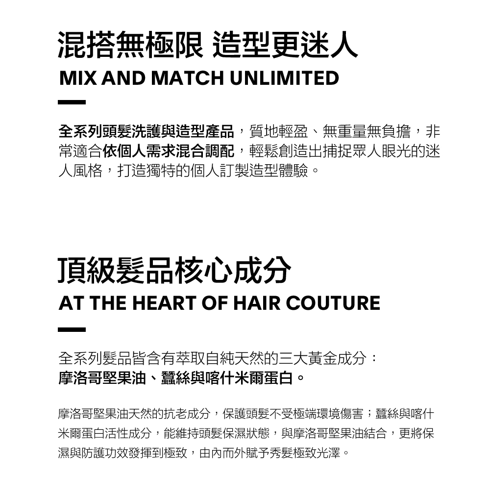 打底造型系列-質地輕盈無重量,可隨意混合調配,充分滿足各種造型需求,打造專屬訂製造型,以純淨潔白、極簡風格的包裝呈現,全系列產品皆含蠶絲蛋白及摩洛哥堅果油營養成分,造型打底同時保濕修護髮絲。