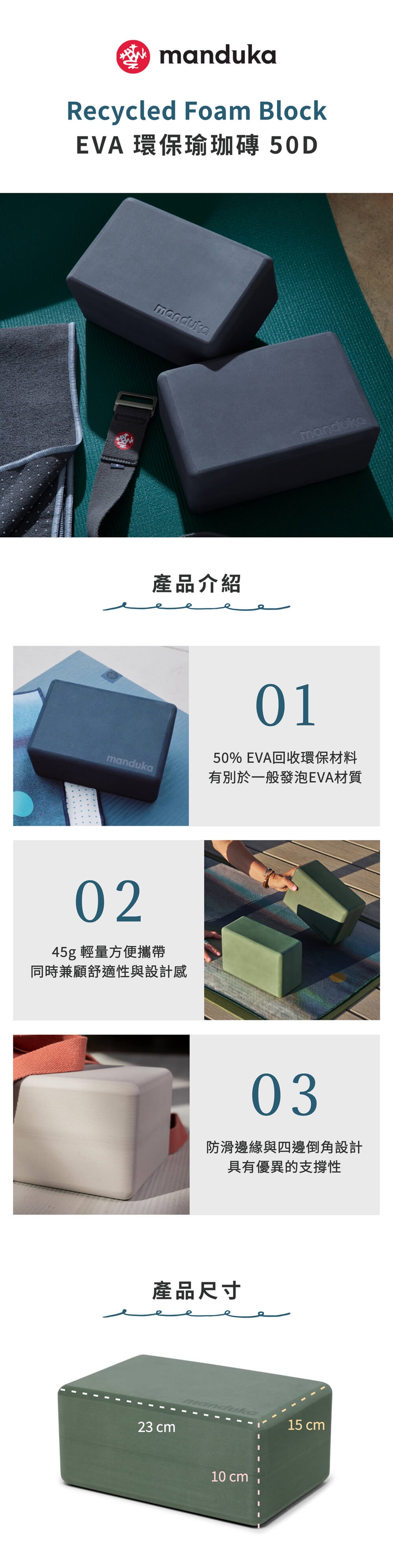 - 使用50% EVA回收環保材料,有別於一般瑜珈磚發泡EVA材質,選擇對環境更友善方式製造。