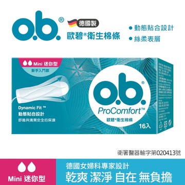 詳細介紹 歐碧衛生棉條迷你型16入【指入非導管】 告別外漏濕悶天天乾爽潔淨! 由德國女性婦科醫師所設計的o.b.獨特棉體結構能與身體結合從體內吸收經血不外漏、讓肌膚透氣。 使用上手後生理期也享有生活品質讓妳不濕、不悶、不測漏生理期也清爽自在! 量少的日子:o.b.迷你型。纖細的前端設計及獨特絲柔表層讓妳在置入棉條或取出時都舒適容易適合量少的日子或初次使用棉條的妳。 注意事項: 1.為避免產生中毒休克症候群(Toxic Shock Syndrome 簡稱TSS) 的病症請於月經期間間隔使用衛生棉條可選擇白天或晚上某一時段時間內使用。 2.曾患過TSS者防患起見請先請教醫師再按指示使用衛生棉條。 3.據報導極少數之婦女在使用衛生棉條時有下列徵狀突發性的高燒(39°C以上)並以嘔吐和腹瀉、手掌及腳掌出現陽光灼傷般之紅疹使用時如有這些現象請即刻取出趕快就醫。 歐碧衛生棉條迷你型16入【指入非導管】 產品請以實際商品為主 有疑問請聯繫消費者諮詢專線 0800-011678 商品規格 商品簡述 由德國女性婦科醫師所設計的o.b.獨特棉體結構能與身體結合從體內吸收經血不外漏、讓肌膚透氣。 品牌 OB歐碧 規格 16入 原產地 德國 深、寬、高 2.7x9.8x5cm 淨重 48 g 保存環境 室溫 是否可門市/超商取貨 Y 商品屬性 許可證核准字號 衛署醫器輸字 第020413號 醫療器材許可證號 衛署醫器輸字 第020413號 有效期間或保存期限 3年 製造日期 如外包裝標示 定期校正之服務及據點資訊 台北市中山區民生東路三段2號10樓 注意事項 避免幼兒誤食請置於幼兒無法取得取得之處 藥商許可執照: 藥商諮詢專線:0800-051-148 許可執照字號:北市衛藥販松字第620101C611號 藥商名稱:台灣屈臣氏個人用品商店股份有限公司 藥商地址:台北市松山區八德路四段760號11樓之1、之2及14樓 藥商諮詢專線:(02)27421234