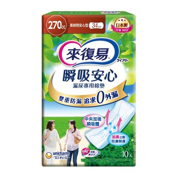 來復易瞬吸安心漏尿專用棉墊長時間安心型270cc 10片