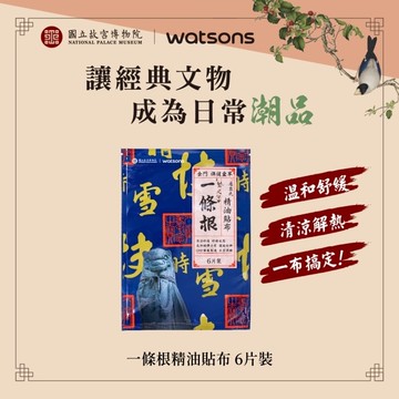 詳細介紹 Watsons一條根精油貼布6片入故宮聯名限定款 清涼舒適舒緩放鬆高伸縮彈力布服貼好撕。GMP藥廠製造品質保證。 貼布實際大小14cmx10cm 將貼布貼於患部4-6小時可休息1小時再繼續使用並可依個人狀況增減使用。 商品規格 商品簡述 Watsons一條根精油貼布6片入(故宮聯名) 品牌 Watsons 屈臣氏 規格 6片 原產地 台灣 深、寬、高 2x15x21cm 淨重 50 g 保存環境 室溫 是否可門市/超商取貨 Y 藥商許可執照: 藥商諮詢專線:0800-051-148 許可執照字號:北市衛藥販松字第620101C611號 藥商名稱:台灣屈臣氏個人用品商店股份有限公司 藥商地址:台北市松山區八德路四段760號11樓之1、之2及14樓 藥商諮詢專線:(02)27421234