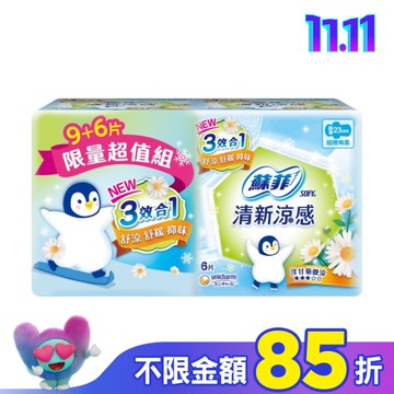詳細介紹 全新蘇菲清新涼感洋甘菊衛生棉!! 商品詳細說明 蘇菲全新品上市 3效合1舒涼、舒緩、抑味 溫和少刺激 蘇菲清新涼感洋甘菊衛生棉添加含天然洋甘菊精華 天然微涼因子舒涼解悶清新抑味3效合1舒緩療癒身心。 添加天然洋甘菊微涼因子 舒涼解悶舒緩療癒 洋甘菊香氛清新抑味 輕薄柔軟透氣舒適 整片舒涼清爽 3效合1舒涼、舒緩、抑味 溫和少刺激 蘇菲清新涼感洋甘菊衛生棉添加含天然洋甘菊精華 天然微涼因子舒涼解悶清新抑味3效合1舒緩療癒身心。 添加天然洋甘菊微涼因子 舒涼解悶舒緩療癒 洋甘菊香氛清新抑味 輕薄柔軟透氣舒適 整片舒涼清爽 商品規格 商品簡述 蘇菲清新涼感微涼洋甘菊23cm(9+6)片 品牌 蘇菲 規格 每包9+6片共15片 原產地 越南 深、寬、高 16.8x9.5x5cm 淨重 110 g 保存環境 室溫 是否可門市/超商取貨 Y 藥商許可執照: 藥商諮詢專線:0800-051-148 許可執照字號:北市衛藥販松字第620101C611號 藥商名稱:台灣屈臣氏個人用品商店股份有限公司 藥商地址:台北市松山區八德路四段760號11樓之1、之2及14樓 藥商諮詢專線:(02)27421234