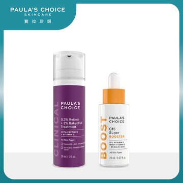 詳細介紹 組合內容 寶拉珍選C15抗老淨白強化精萃20ml*1+ 寶拉珍選 0.3%A醇+2%補骨脂酚精華乳30ml*1 【寶拉珍選C15抗老淨白強化精萃20ml】 針對美白提亮需求所打造寶拉珍選15%高濃度維他命C美白精華-C15抗老淨白強化精萃推薦搭配混合任一精華液或保濕產品可加強肌膚明亮度、對抗暗沉蠟黃與膚色不均美白、淡化黑色素全面提升肌膚透亮光澤。 添加高濃度15%維他命C淡化黑色素、明亮膚色 協同阿魏酸、維他命E加乘美白效果 多種抗氧化與保濕成分舒緩修護肌膚、強化防護力 輕盈水感的精萃質地所有膚質適用可搭配其他程序或單獨使用 無人工香料、無色素、無酒精 產品特色:蘊含高濃度15%維他命C及多種抗氧化與保濕成分的美白精華C15抗老淨白強化精萃透過優異的保養配方有效改善膚色不均、暗沉蠟黃的問題還可以強化肌膚對抗紫外線及多種外部刺激的防護力。 產品功效:C15抗老淨白強化精萃採用美國皮膚科醫學會認可的亮白黃金比例完美結合15% 維生素C與強力抗氧化成分阿魏酸與1%維他命E能夠強化並穩定維他命C的功效達到深度淨白、修護多種老化痕跡打造年輕健康、明亮細緻的肌膚。 【寶拉珍選 0.3%A醇+2%補骨脂酚精華乳30ml】 三大明星抗老成分A醇、胜肽、植物型抗老成分-補骨脂酚的寶拉珍選0.3%A醇抗老修護精華0.3%A醇+2%補骨脂酚精華乳 抗老黃金比例鎖定肌膚多重老化問題強化A醇抗老功效撫紋、讓肌膚更細緻平滑明亮年輕有活力 +0.3%A醇漸進式濃度撫平老化痕跡、細紋皺紋、細緻毛孔紋理 +植物性抗老成分補骨脂酚加強A醇功效、肌膚加倍年輕 +協同多種胜肽強化肌底結構、恢復肌膚彈力 +柔滑乳液質地所有膚質適用 +無添加人工香料、無添加色素、無添加酒精 產品特色 研究顯示配方中同時添加補骨脂酚及A醇能夠發揮更卓越的抗老效果。萃取自天然植物的補骨脂酚不僅有著媲美A醇的修護效果還能幫助A醇更有效率且持續穩定的發揮抗老修護、撫紋抗皺的效果。此外0.3%A醇+2%補骨脂酚精華乳結合多種胜肽深入肌底提升肌膚彈力重啟青春緊緻。 獲獎紀錄 +2022 Bazaar 抗老大賞 最佳電商乳液乳霜 +2020 AskMen Grooming Award Best Anti-Aging Treatment 產品功效 0.3%A醇+2%補骨脂酚精華乳含有三大抗老明星成分0.3%A醇、2%補骨脂酚及多種胜肽多層次的修護精華可以迅速針對紋路、膚色不均及粗大毛孔等老化問題做改善讓肌膚修護力升級改善粗糙暗沉還原健康細緻膚觸 商品規格 商品簡述 寶拉珍選C15抗老淨白強化精萃20ml*1+寶拉珍選 0.3%A醇+2%補骨脂酚精華乳30ml*1 品牌 寶拉珍選 原產地 美國 深、寬、高 6x3.4x8.7cm 淨重 340 g 容量 50 ml 保存環境 室溫 是否可門市/超商取貨 Y 商品屬性 有效期限 547 藥商許可執照: 藥商諮詢專線:0800-051-148 許可執照字號:北市衛藥販松字第620101C611號 藥商名稱:台灣屈臣氏個人用品商店股份有限公司 藥商地址:台北市松山區八德路四段760號11樓之1、之2及14樓 藥商諮詢專線:(02)27421234