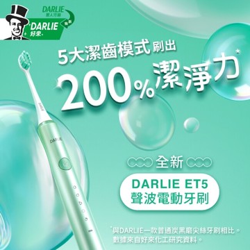 詳細介紹 DARLIE 好來 ET5 聲波電動牙刷 +DARLIE 好來 ET5 高密螺旋深潔替換刷頭 產品特性(配合正確刷牙習慣) 1. 高達42000 次/分鐘高頻振動 2. 5 大潔齒模式隨心選擇 3. 兩分鐘定時30 秒換向提醒 4. 模式記憶功能 5. USB 充電 6. IPX7 全機身防水 7. 密毛潔淨刷頭 8. 目標客群注重深度牙齒清潔且願意付出較高價格購買優質牙刷產品 DARLIE 好來ET5 高密螺旋深潔替換刷頭 產品特性(配合正確刷牙習慣) 1. 含進口螺旋刷毛 : 螺旋刷毛橫切面呈六角形可以深入牙縫。刷頭清潔力達200%*。 2. 3 倍高密軟毛^ : 綿密舒適有效潔淨同時呵護牙齦。 3. 大小孔刷頭設計 : 外圈大孔植毛加大刷毛數量舒適潔齒。中間小孔植毛細緻清潔牙齒表面。 *與一款DARLIE 普通炭黑磨尖絲牙刷比較 ^與一款DARLIE 普通螺旋磨尖絲電動牙刷的刷毛數量比較 4. 目標客群注重深度牙齒清潔且願意付出較高價格購買優質牙刷產品 商品規格 商品簡述 聲波電動牙刷 品牌 Darlie 好來 規格 1+1/組 原產地 中國 深、寬、高 5.2x2.9x9cm 淨重 315 g 保存環境 室溫 是否可門市/超商取貨 Y 商品屬性 有效期限 3650天 藥商許可執照: 藥商諮詢專線:0800-051-148 許可執照字號:北市衛藥販松字第620101C611號 藥商名稱:台灣屈臣氏個人用品商店股份有限公司 藥商地址:台北市松山區八德路四段760號11樓之1、之2及14樓 藥商諮詢專線:(02)27421234
