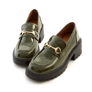 (限時⬊5折)GREEN PINE方頭馬銜扣牛漆皮樂福粗跟鞋 灰薄荷綠色 (00393219)