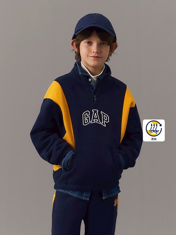 男童裝 Logo刺繡刷毛立領長袖上衣-海軍藍