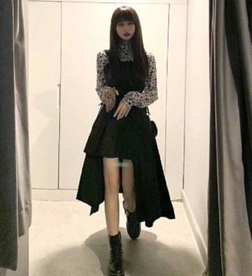 豹紋長袖t卹+暗黑吊帶不規則連衣裙兩件套