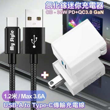 點我下載cb35w gan氮化鎵type-c(pd)+usb快充白+耐彎折編織線usb to c-黑1.2米