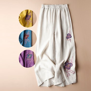 夏季復古棉麻繡花闊腿九分褲(m-3xl)