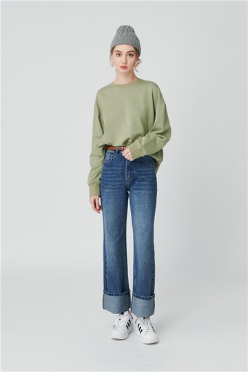 松緊腰九分卷邊棉麻直筒牛仔褲