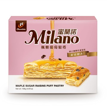 | \t\t\t 商品規格 \t\t\t | \t\t\t\t\t\t 1.商品品名: 蜜蘭諾楓糖葡萄鬆塔量販盒 \t\t\t2.商品重(容)量:144g \t\t\t3.內容物成分(如含有豬、牛成分請加註國別):麵粉、棕櫚油、蔗糖、葡萄乾、葡萄糖粉、食鹽、無水奶油、大豆油、楓糖、香料 \t\t\t營養標示 每一份量 : 11.5公克 本包裝含 : 12份 每份每日參考值百分比 熱量 : 63大卡 3% 蛋白質 : 0.8公克 1% 脂肪 : 3.6公克 6% 飽和脂肪 : 1.8公克 10% 反式脂肪 : 0公克 * 膽固醇(自願標示者) : 毫克 碳水化合物 : 6.8公克 2% 糖 : 1.7公克 * 膳食纖維(自願標示者) : 公克 鈉 : 62毫克 3% \t\t\t備註欄:產品含有牛奶及其製品、蛋及其製品、堅果類及其製品、含麩質之穀物及其製品、大豆及其製品。 本產品製造廠房,其設備有處理芒果、花生、芝麻。請置於28℃以下保存,避免放置高溫、潮濕或陽光直射之場所,產品拆封後,請立即食用 \t\t\t | \t\t