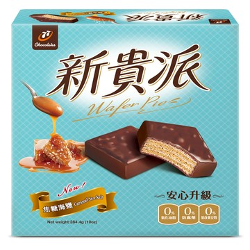 | \t\t\t 商品規格 \t\t\t | \t\t\t\t\t\t 1.商品品名:新貴派焦糖海鹽 \t\t\t2.商品重(容)量:284.4g /袋 營養標示 每一份量 : 15.8公克 本包裝含 : 18份 每份 熱量 : 90大卡 蛋白質 : 1公克 脂肪 : 5.7公克 飽和脂肪 : 3.8公克 反式脂肪 : 0公克 碳水化合物 : 8.7公克 糖 : 4.8公克 鈉 : 39毫克 \t\t\t備註欄:產品含有牛奶及其製品、蛋及其製品、堅果類及其製品、含麩質之穀物及其製品、大豆及其製品。 本產品製造廠房,其設備有處理芒果、花生、芝麻。請置於28℃以下保存,避免放置高溫、潮濕或陽光直射之場所,產品拆封後,請立即食用 \t\t\t | \t\t
