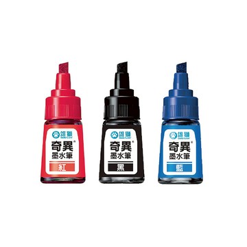 奇異筆的墨水飽和度比較高,屬油性快乾型,三角玻璃瓶裝,造型獨特且墨色看得見。用以一般書寫、標記、補線或是細部上色都相當好用,但是不建議用來做大面積著色,斜頭筆尖可繪製粗細面,呈現更多書寫技法,加上豐富鮮艷的色彩,擁有更多配色變化與創作空間。