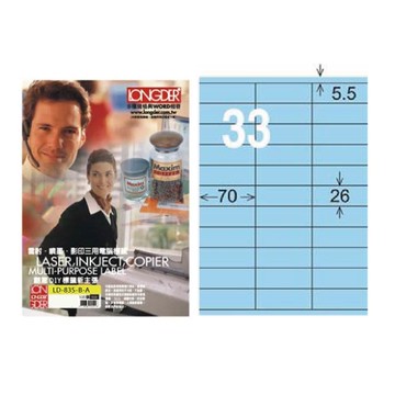 【龍德】LONGDER 三用電腦標籤 A4 33格 26*70mm淺藍105張 3盒/組 LD-835-B-A(適用雷射、噴墨、影印)