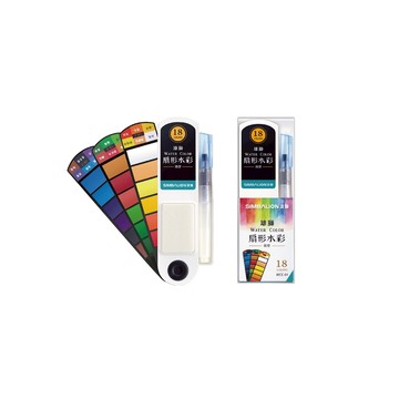 採用扇形設計的塑膠繪具盒包裝,內附矩形固體狀透明水彩、水筆一支、吸水海綿,底盤可當調色盤,體積輕巧,放在口袋內攜帶方便,非常適用於戶外寫生及隨筆創作。可依需求選購18色或24色,顏色飽和度高,無論新手或專業藝術家,都能輕鬆掌握,底盤可當調色板,附水筆與可拆卸吸水海綿,巧妙設計,方便實用,更有助輕鬆完成每一幅作品。