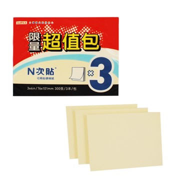 【N次貼】超值包-可再貼便條紙 76x101mm 黃、三色 300張/3本 61005、61006 - 多款可選