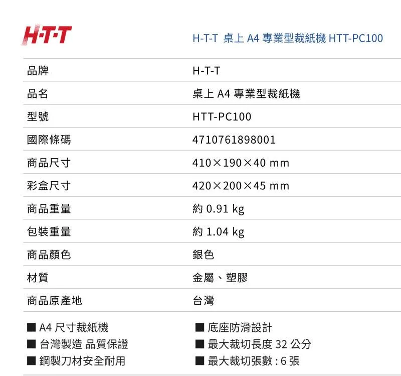 【HTT】桌上 A4 專業型 裁紙機 /台 HTT-PC100