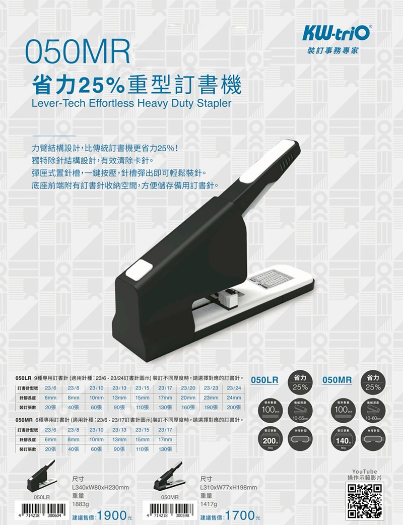 KW-trio 力臂 重型 訂書機 省力25% ( 單次約140張) /台 050MR