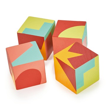 4個色彩鮮豔的木製立方體的積木,6面均彩繪鮮艷的圖案。將4個積木拼組成正方形,可以看到6種不同的幾何圖形,圓形、正方形、星形、心形、十字形和五邊形。它可以吸引孩子按照圖案和線條排列、圖像平衡、分類或堆疊玩具。