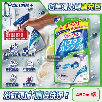 [日日好物]日本LION獅王-LOOK PLUS免刷洗浴缸去鈣除垢消臭衛浴清潔噴霧補充包450ml/袋-柑橘香(綠標)(約60秒瞬效潔淨去異味,多功能浴室泡沫去污劑)