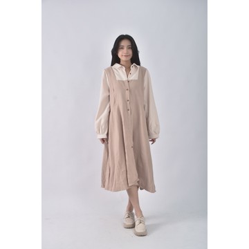 純色微磨毛異材質紗裙拼接腰間抽皺長洋裝-OB大尺碼