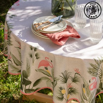 為你的餐桌增添一抹自然風情!這款熱帶風情圓形桌布以柔和的亞麻米色為基底,搭配粉紅火鶴鳥、鳳梨與綠葉印花,營造出濃濃夏日渡假氛圍。桌布尺寸150x150公分,適用於多數圓形餐桌或戶外休閒桌面。