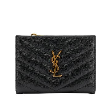 YSL 山形紋魚子醬皮金字拉鍊零錢袋二折短夾/黑色
