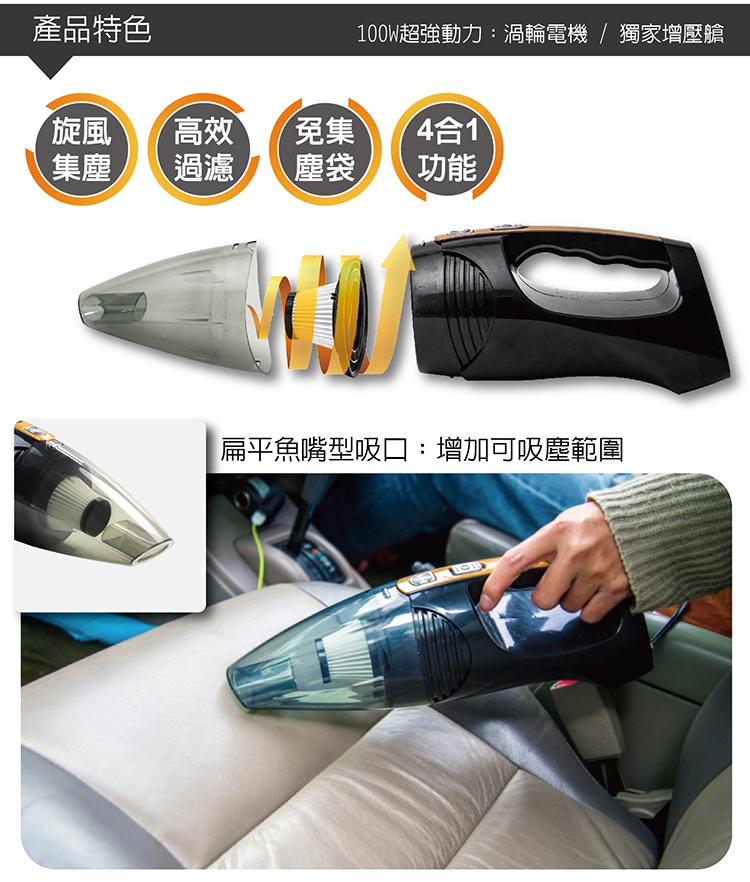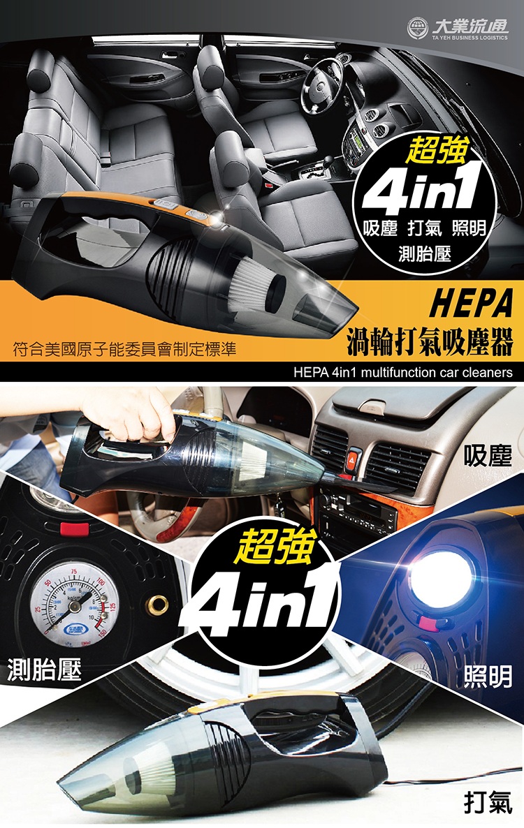 100W吸塵 HEPA濾網 5分鐘輪胎打氣 測胎壓 LED燈