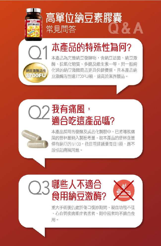 排除堆積:高劑量納豆激酶3700FU/顆,健康循環、精神好。