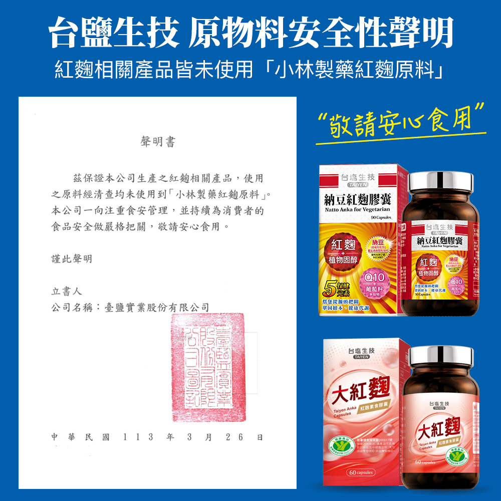 台塩「納豆紅麴膠囊」全新升級,新添加專利植物固醇與專利葡萄籽萃取物提供更全面的健康照護,搭配納豆發酵萃取物、紅麴及輔酵素Q10,提供完整營養補給促進體內新陳代謝