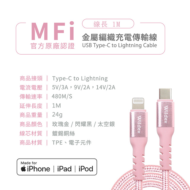 【Wildex】Type-C to Lightning 蘋果認證/金屬編織PD快充線/充電傳輸線(1M)