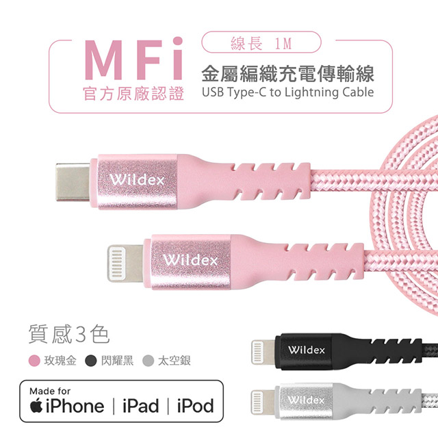 【Wildex】Type-C to Lightning 蘋果認證/金屬編織PD快充線/充電傳輸線(1M) 玫瑰金