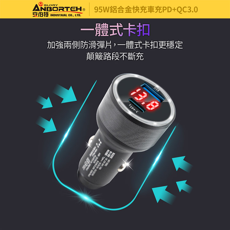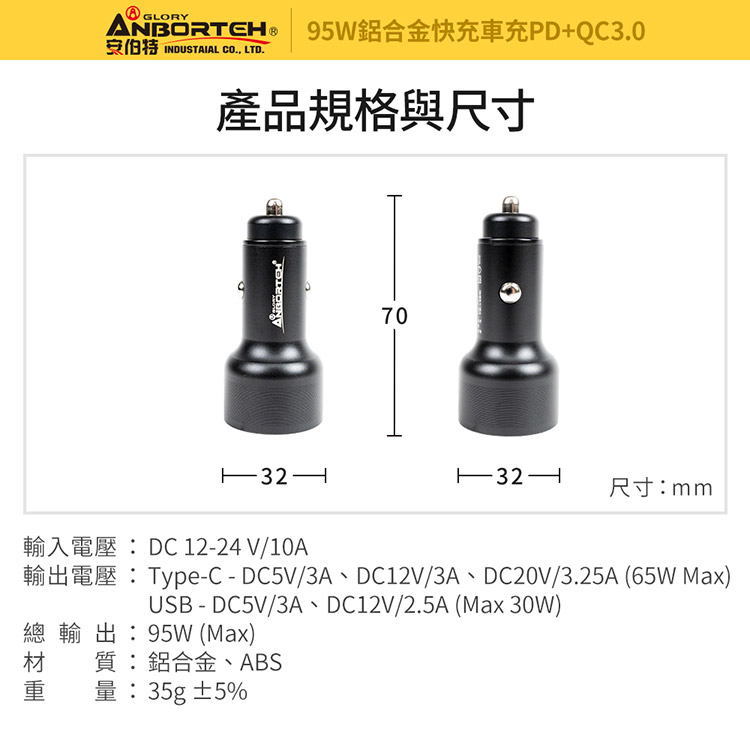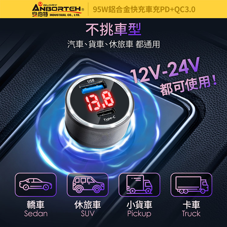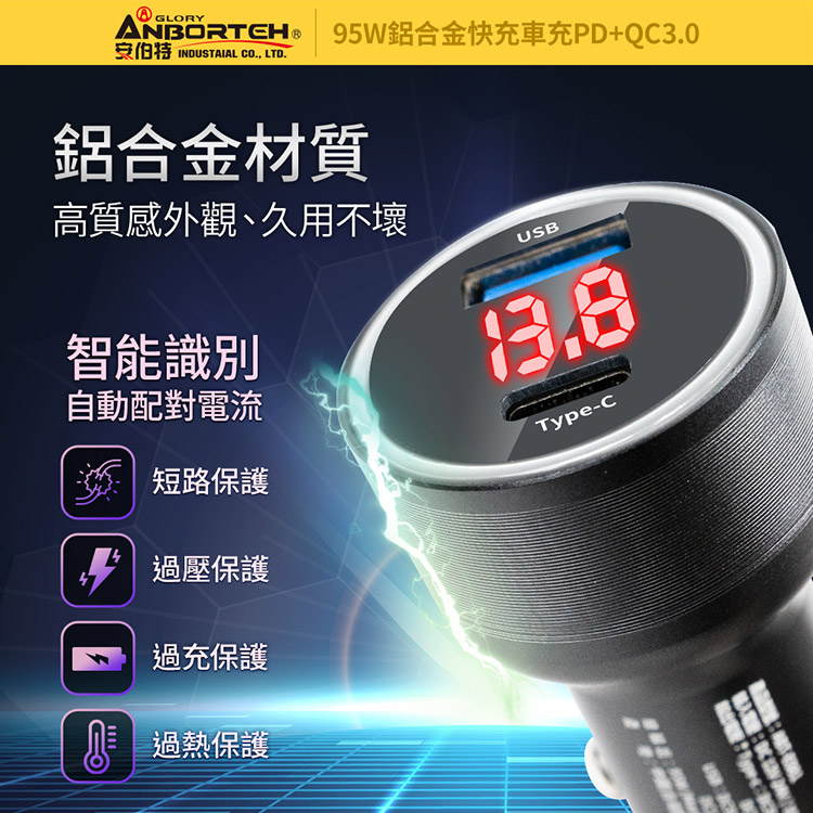 【安伯特】酷電大師 95W鋁合金快充車充PD+QC3.0 (國家認證 一年保固) 12V/24V皆可使用 過充保護