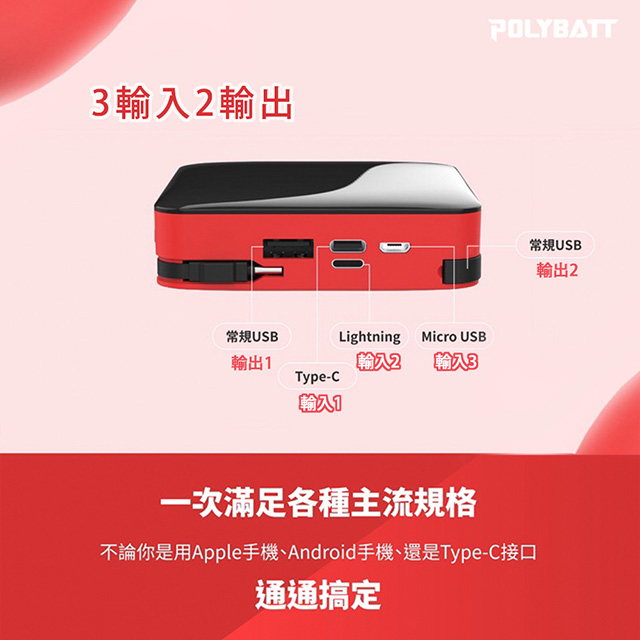 可拆式自帶線 10000大容量行動電源(Lightning+Type-c+USB A) 台灣製造