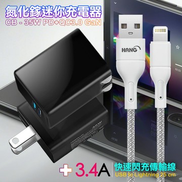 CITY 35W Gan氮化鎵Type-C(PD)+USB快充黑+HANG 高密編織 iPhone Lightning USB 3.4A快充充電線25cm