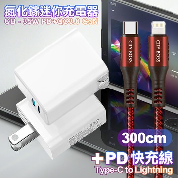 CITY 35W Gan氮化鎵Type-C(PD)+USB快充白+勇固Type-C to Lightning PD編織耐彎折快充線-300cm-紅