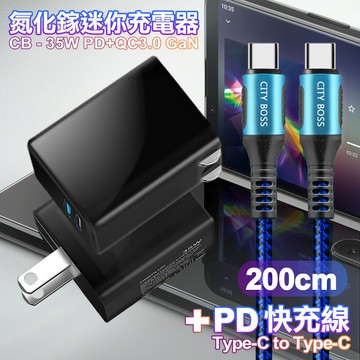 CITY 35W Gan氮化鎵Type-C(PD)+USB快充黑+勇固Type-C to Type-C 100W閃充編織快充線-200cm-藍