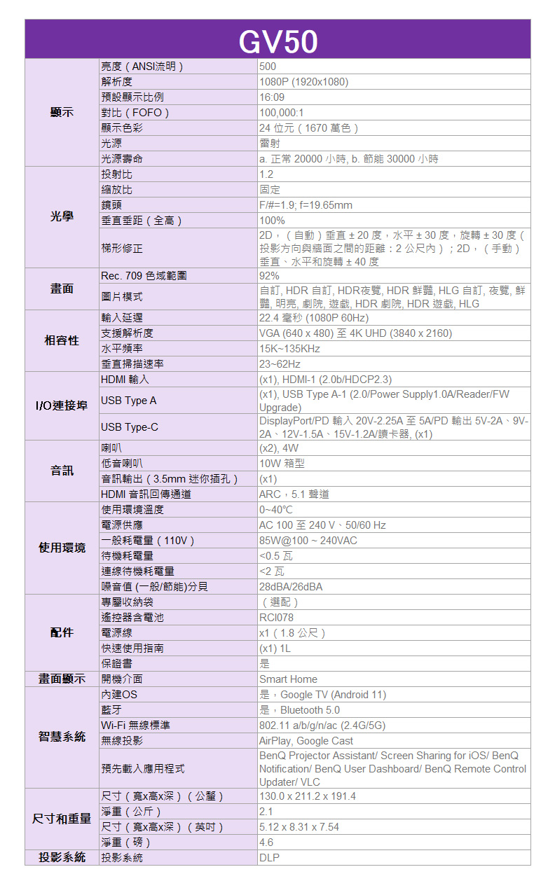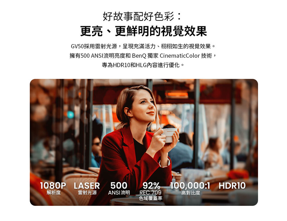 BenQ 1080p Google TV 雷射智慧微型投影機 GV50