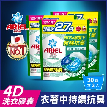 【日本 ARIEL】4D超濃縮抗菌洗衣膠囊/洗衣球 30顆袋裝 x3 (室內晾衣型) (共90顆)