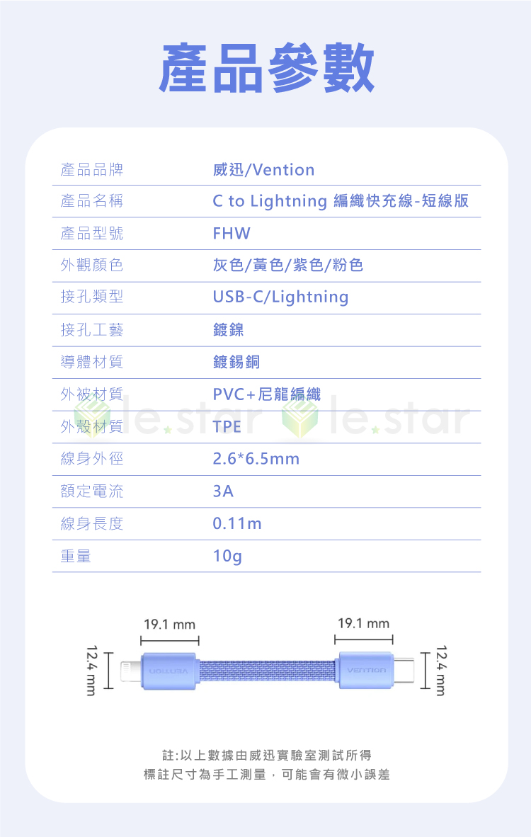 Vention 威迅 FHW系列 Type-C to Lightning 編織快充線-短線版 11cm 紫色