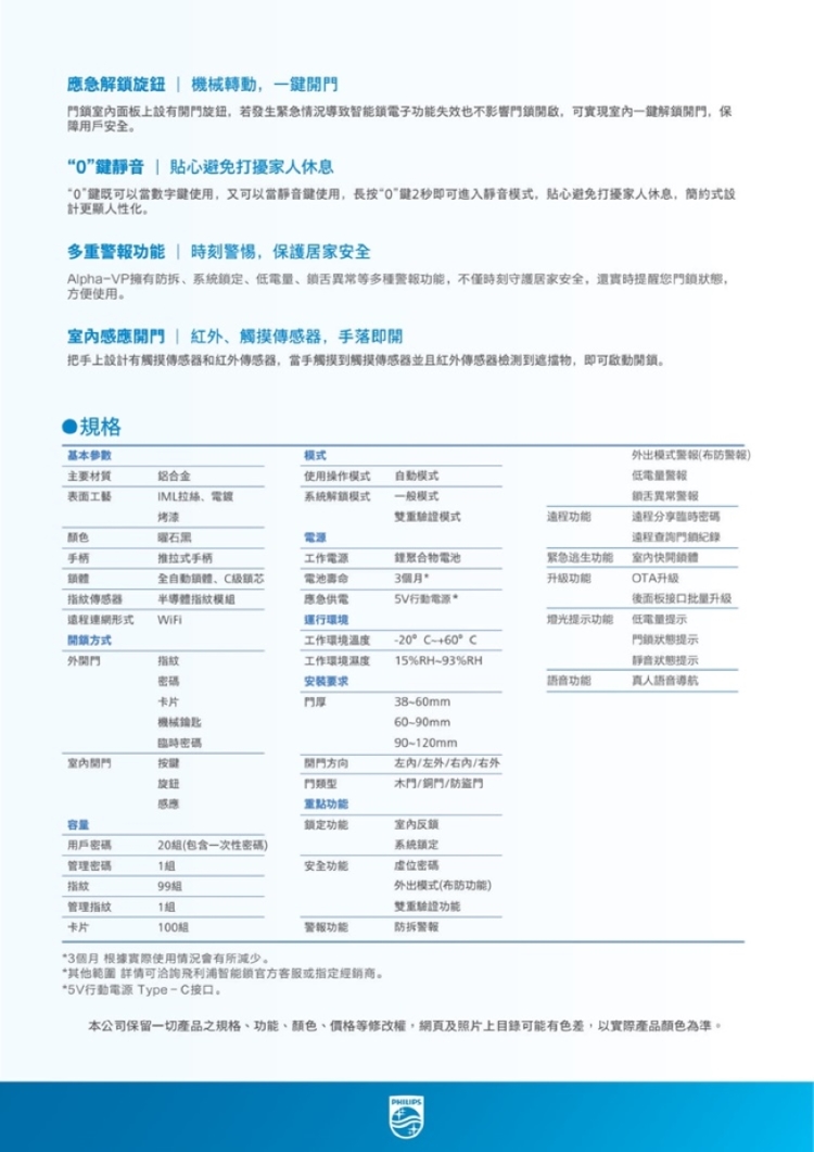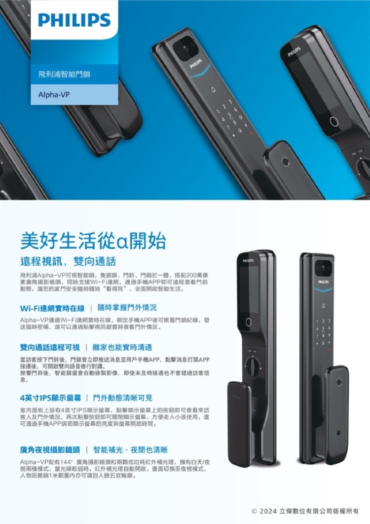 【Philips 飛利浦】ALPHA VP 貓眼推拉電子鎖(貓眼│指紋│卡片│密碼│鑰匙│WiFi/含安裝)