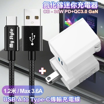 CITY 35W Gan氮化鎵Type-C(PD)+USB快充白+MyStyle 耐彎折編織線 USB to Type-C-黑120cm