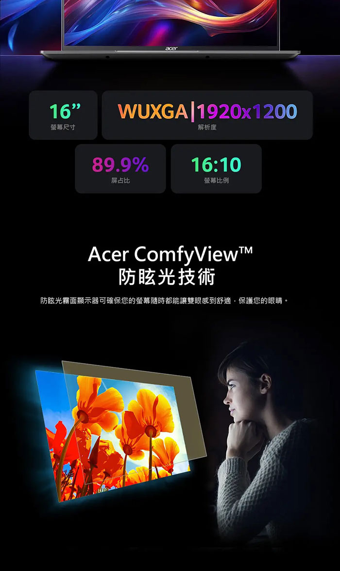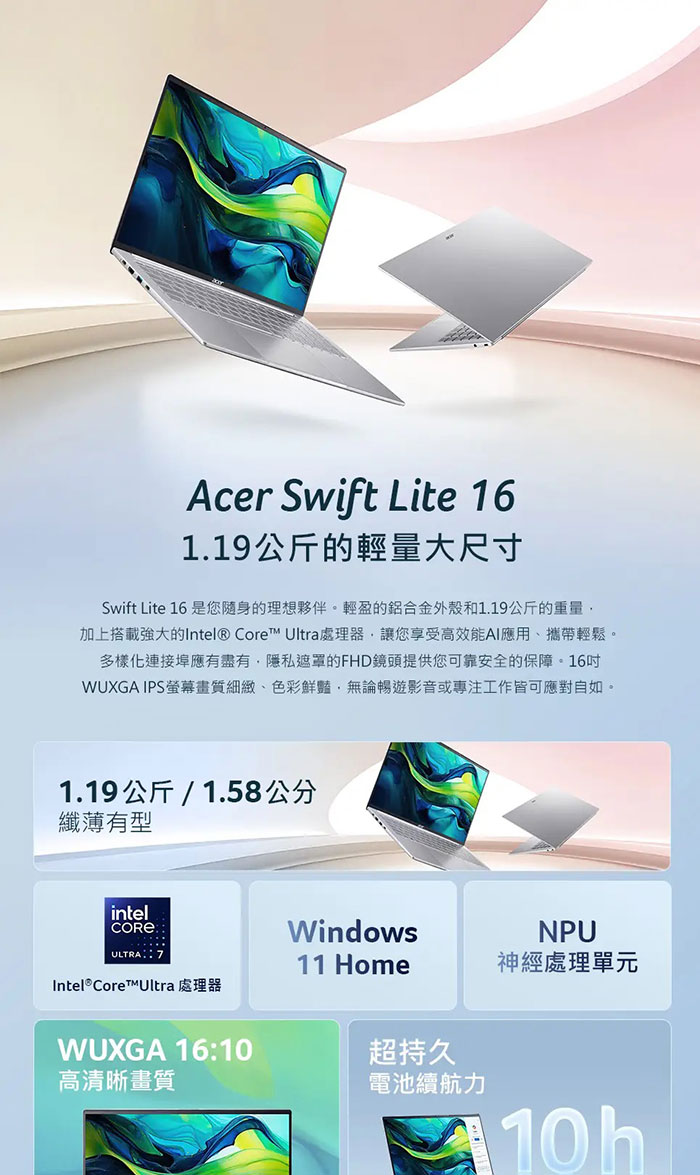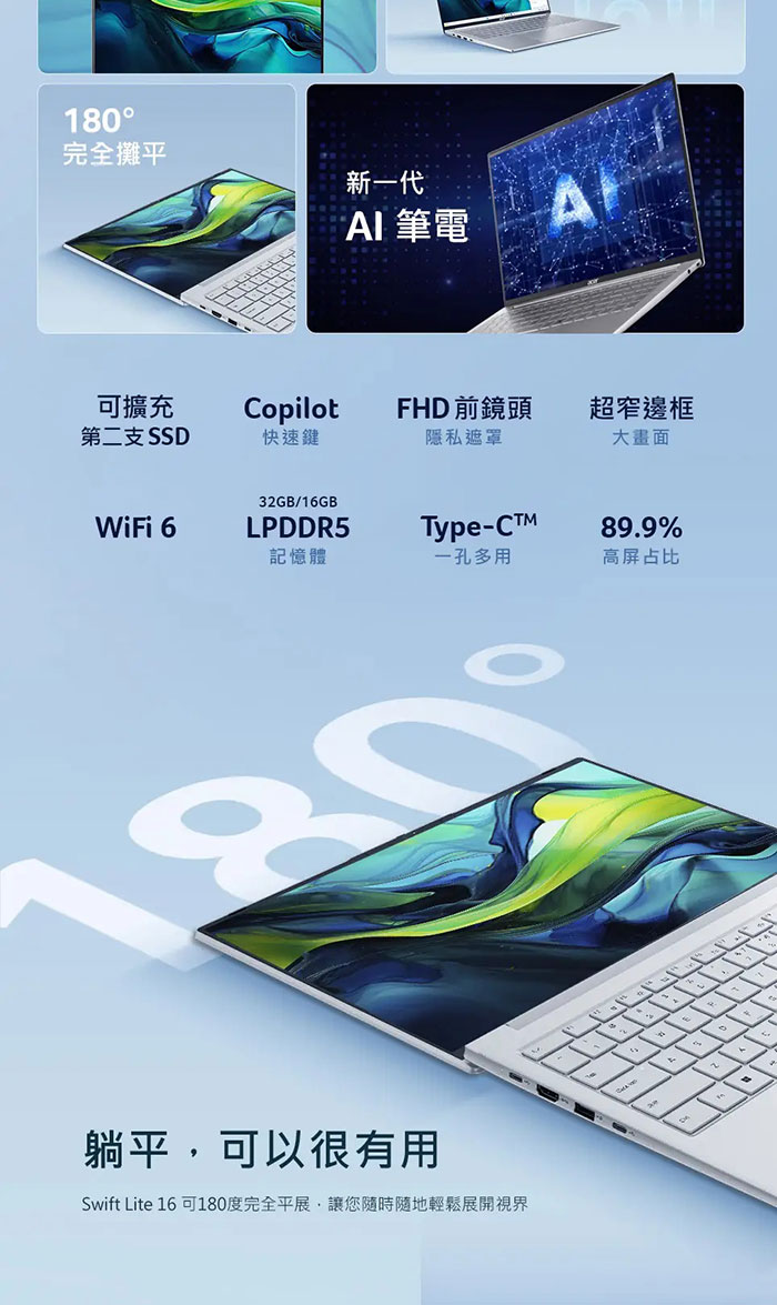 Acer Swift Lite|SFL16-41M-R10R 16吋輕薄AI筆電(R5-240/16G/512G/WIN11)