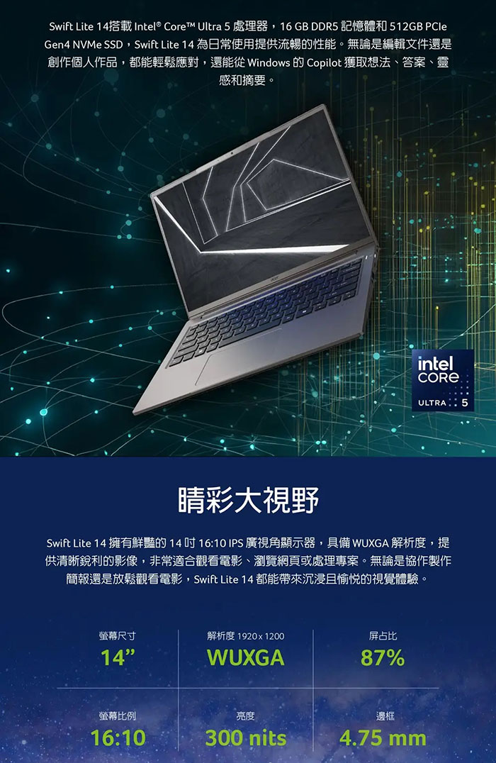 Acer Swift Lite | SFL16-51M-5184 16"輕薄AI筆電(U5-115U/16G/512G/WIN11) 銀色