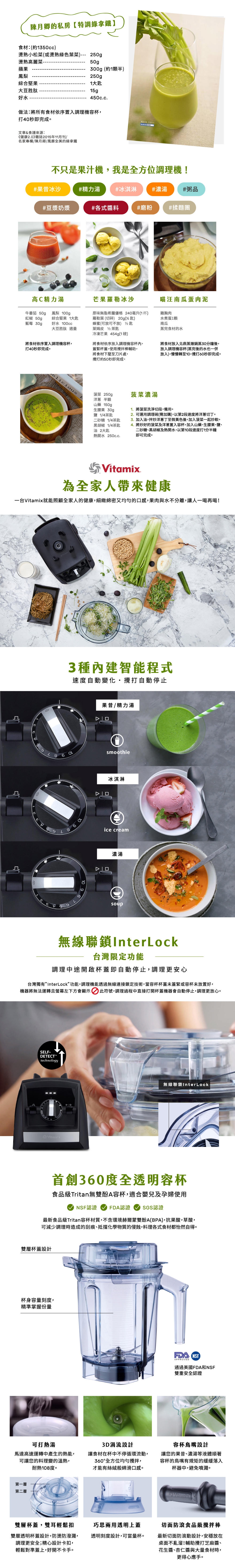 ●Vitamix延續經典再進化!並增設3項智能調理程式─果昔、冰品、濃湯,自動計時調理,攪打完成自動停止,不必看顧。