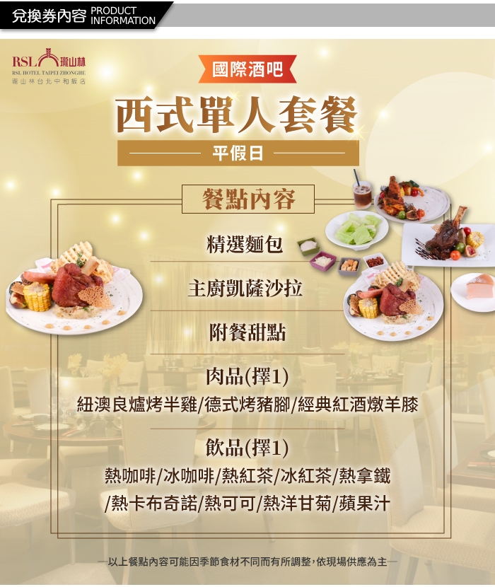 2025【台北】瓏山林中和飯店平假日西式單人套餐T