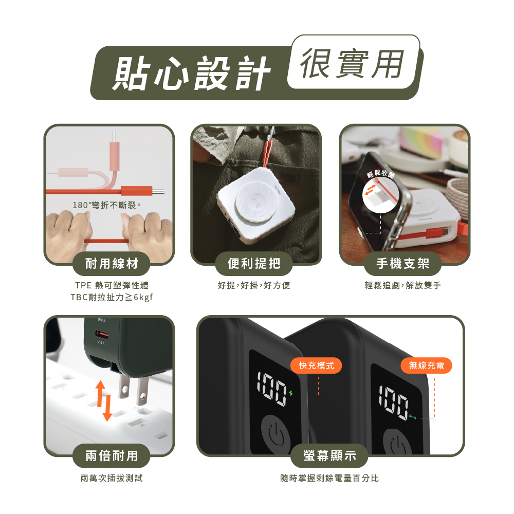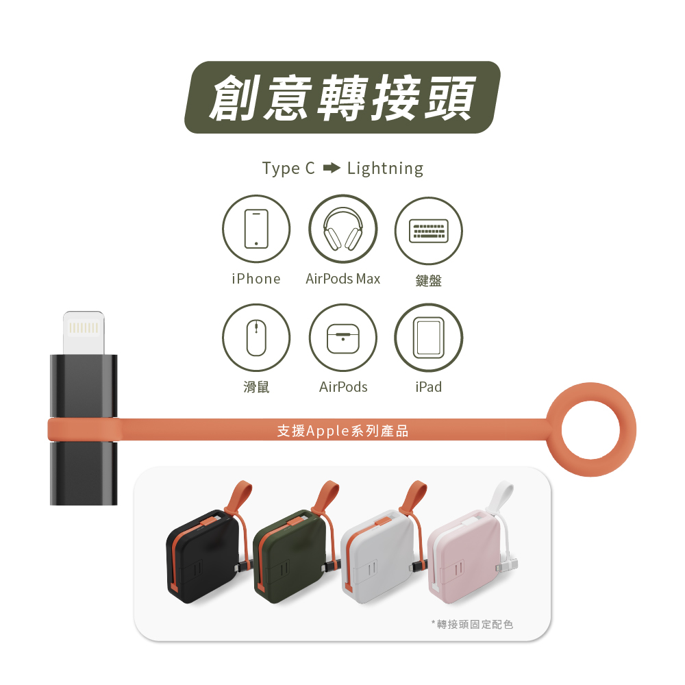 • 自帶AC插座、便利提把、橫置手機支架、USB-C to Lightninig創意轉接頭
